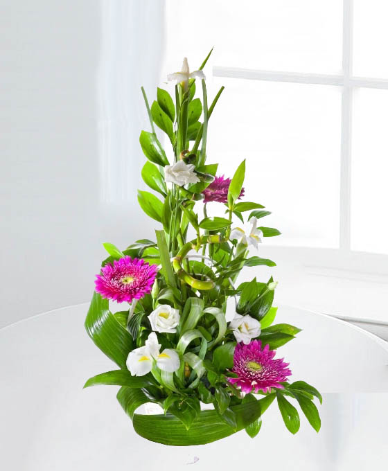 De diseño, aspecto primaveral y especialmente bonito es este Centro Bambú. Es un centro de flores de regalo compuesto por bonitas flores como las gerberas, los iris, los lisianthums, y con el especial toque del bambú, que le da un aspecto totalmente diferente y con un diseño especial, todo ello decorado también con bonitos verdes silvestres. En nuestra Floristería, su floristería online, podemos ayudarle a hacer el regalo perfecto. Haremos llegar a su ser querido, todo el amor y alegría que quiere demostrar con los centros de flores de regalo.