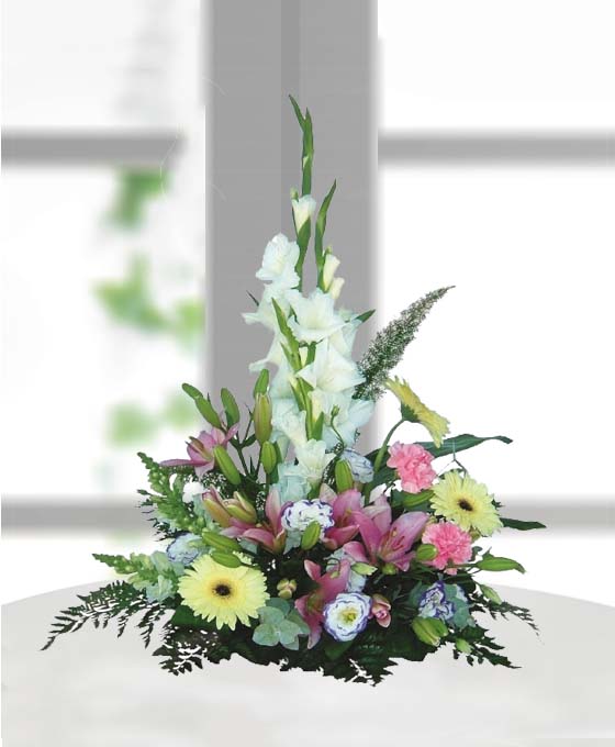 Precioso Centro Flores Guinea. Es un centro de flores de regalo compuesto por bonitas flores como, como gladiolos, liliums, gerberas, lisiamthums, claveles, todas ellas en tonos pasteles, todo ello decorado con bonitos verdes. En nuestra online, expertos en el arte floral, podemos ayudarle a hacer el regalo perfecto. Haremos llegar a su ser querido, todo el amor y alegría que quiere demostrar con este bonito centro de flores a domicilio. Sin duda, lo que quiere es hacer el mejor regalo.