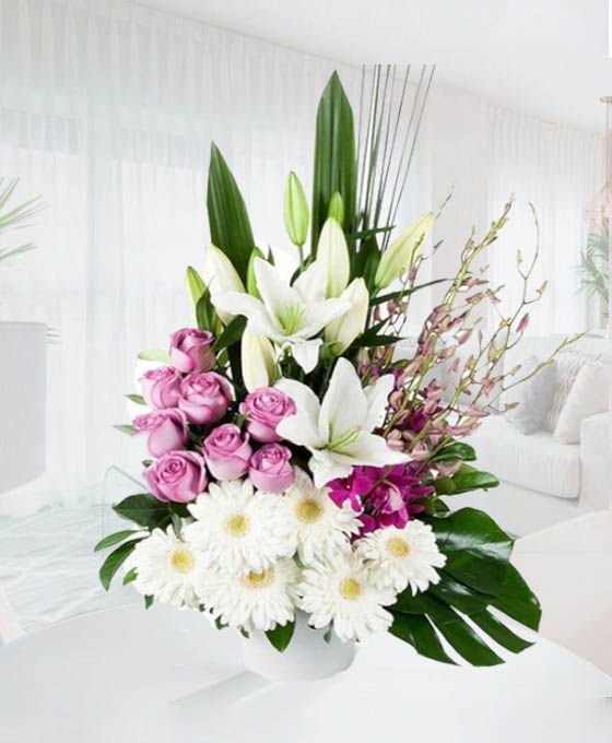 Elegante y especial, este Centro Flores Zambia, es un centro de flores de regalo de diseño, luminoso, fresco y romántico. Compuesto por bonitas flores como las rosas, el lilium, las gerberas y decorado con elegantes verdes. Seguro que quiere hacer el regalo perfecto, y enviar flores a domicilio, las mejores. Su floristería online, podemos ayudarle a hacer el mejor regalo de todos. Haremos llegar a su ser querido, todo el amor y alegría que representa este bonito centro de flores.