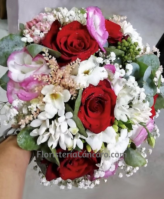 Alegre, bonito y fresco Ramo Camariñas, realizado con Rosas rojas, lisianthus y paniculata. Sin duda, si queremos alegrar el día a una persona es el ramo adecuado. Es un detalle bonito y especial que presenta nuestra Floristería. Un poco de la madre naturaleza trasladado a un bonito ramo de flores. Es el ramo ideal para regalar que sin duda podemos hacer si lo que queremos es alegrar el día a esa persona tan especial. Este ramo es de tamaño mediano.