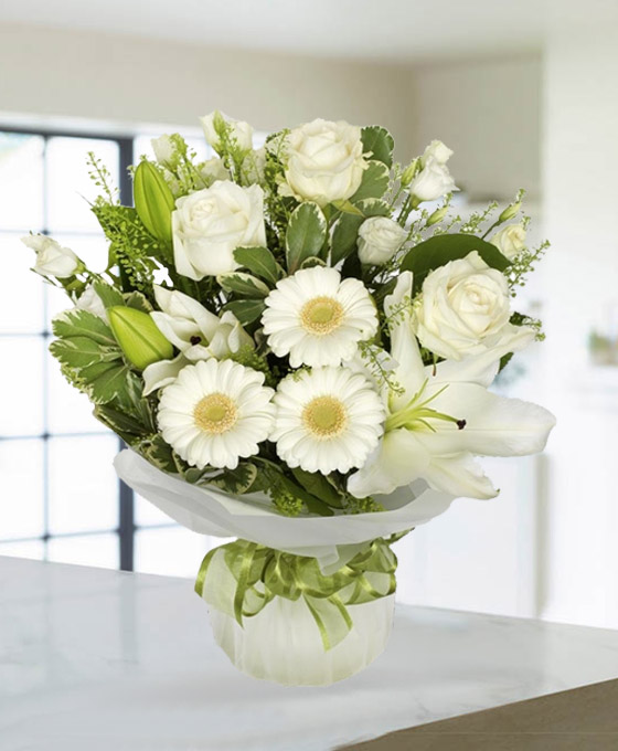 Precioso este Ramo Flores París, confeccionado con preciosas flores como son las rosas, el lilium, el lisianthum y las gerberas, en tonos blancos y decorado con elegantes verdes que realzan todavía más la belleza de las flores blancas. Sin duda, un ramo de flores blancas de regalo, especial para una ocasión especial, como puede ser dar la bienvenida a un bebé, regalar a tu pareja, o bien simplemente por el deleite de las flores blancas, muy apreciadas por la dulzura e inocencia que inspiran. Es el regalo perfecto, que sin duda podemos hacer si lo que queremos es alegrar un bonito día. Bonito ramo de flores blancas de regalo que presenta nuestra Floristería.