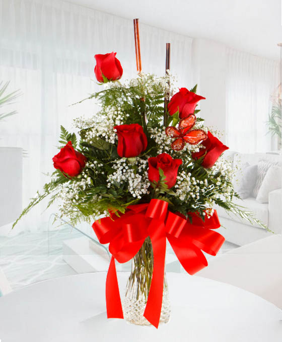 Bonito y elegante, siempre este Ramo de 6 Rosas. Regalar rosas es el regalo ideal. Esta confeccionado con 6 rosas de tallo largo y decorado con paniculata, es el mejor regalo para esa persona especial, e ideal para regalar en cualquier momento, si lo que queremos es enviar rosas rojas a domicilio. Nuestros ramos de rosas están realizados siempre con flores de primera calidad y frescas. Son suministradas diariamente por proveedores nacionales e internacionales. Los ramos de rosas para regalo, están realizados siempre por floristas profesionales, especialistas en el arte floral, por lo que siempre presentamos un producto fresco y elaborado con mucho mimo. Además, ofrecemos un servicio de envío de arreglos florales.